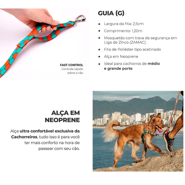 A Guia Tradicional Cachorreiros Honey para Cães conta com alça Super confortável em Neoprene e um sistema exclusivo Cachorreiros® encurta guia. Mosquetão com trava de segurança em Liga de Zinco (ZAMAC).