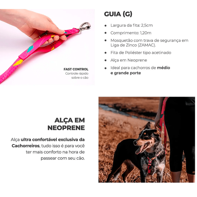 A Guia Tradicional Cachorreiros Olivia para Cães conta com alça Super confortável em Neoprene e um sistema exclusivo Cachorreiros® encurta guia. Mosquetão com trava de segurança em Liga de Zinco (ZAMAC).