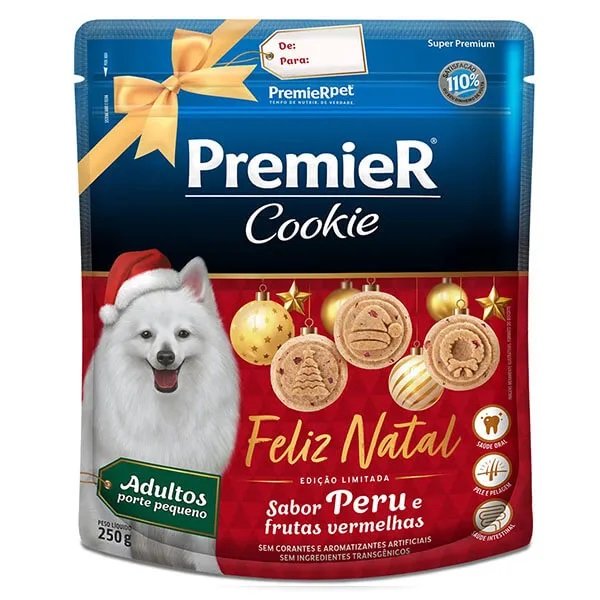 Petiscos Premier Cookie Natal para Cães Adultos Raças Pequenas Sabor Peru e Frutas Vermelhas 250g