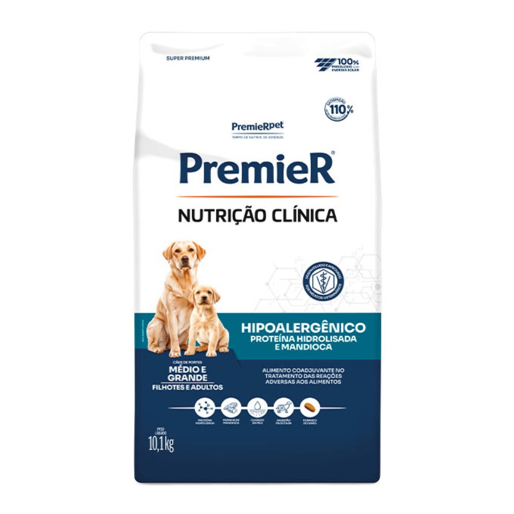 A Ração Premier Nutrição Clínica Hipoalergênico HID MD/GR para Cães Adultos de Médio e Grande Porte é um alimento coadjuvante desenvolvido para auxiliar no controle de reações adversas ao alimento, que podem se manifestar por sintomas dermatológicos, como coceiras e lesões na pele, ou por alterações intestinais, como vômitos e diarreia.