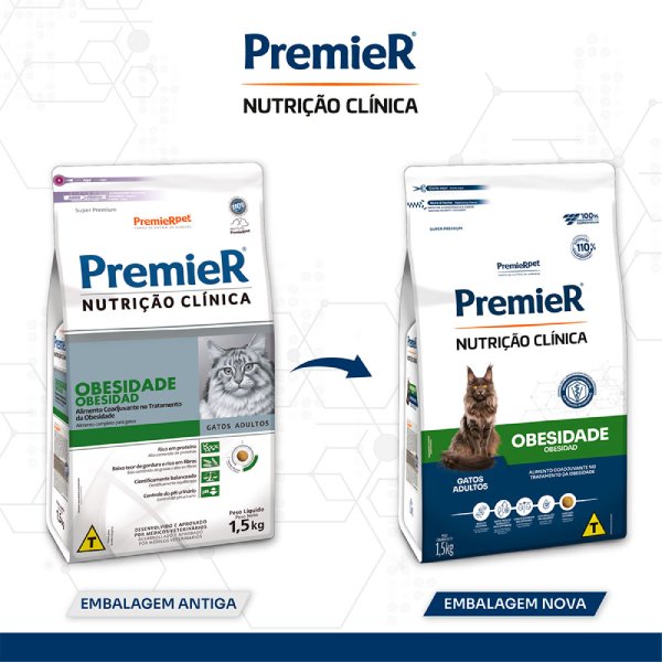 A Ração Premier Nutrição Clínica Obesidade para Gatos Adultos é um alimento Super Premium auxiliar ao tratamento de gatos adultos com excesso de peso para a obtenção do peso ideal. Uma alimentação específica para perda de peso é essencial para o tratamento da obesidade por oferecer quantidade controlada de alimento com calorias reduzidas e por fornecer todos os nutrientes necessários para perda de peso gradativa e saudável. Este alimento deve ser utilizado de acordo com o grau de obesidade do seu gato e sempre sob orientação do médico veterinário.