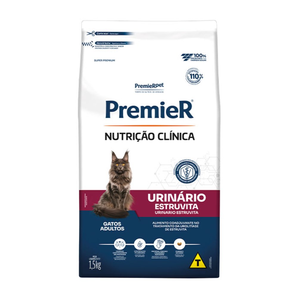 A Ração Premier Nutrição Clínica Urinário para Gatos Adultos é um alimento Super Premium auxiliar ao tratamento dos cálculos urinários de estruvita. Algumas alterações na alimentação podem ser benéficas em pacientes com cálculos urinários. Os objetivos da dieta são controlar o pH urinário, diminuir a ingestão e excreção urinária de substâncias formadoras de cálculo e auxiliar na dissolução dos cálculos já formados. Este alimento deve ser utilizado como único alimento, em geral, pelo período de 4 a 5 semanas podendo variar de acordo com o animal, sempre sob orientação de um profissional.