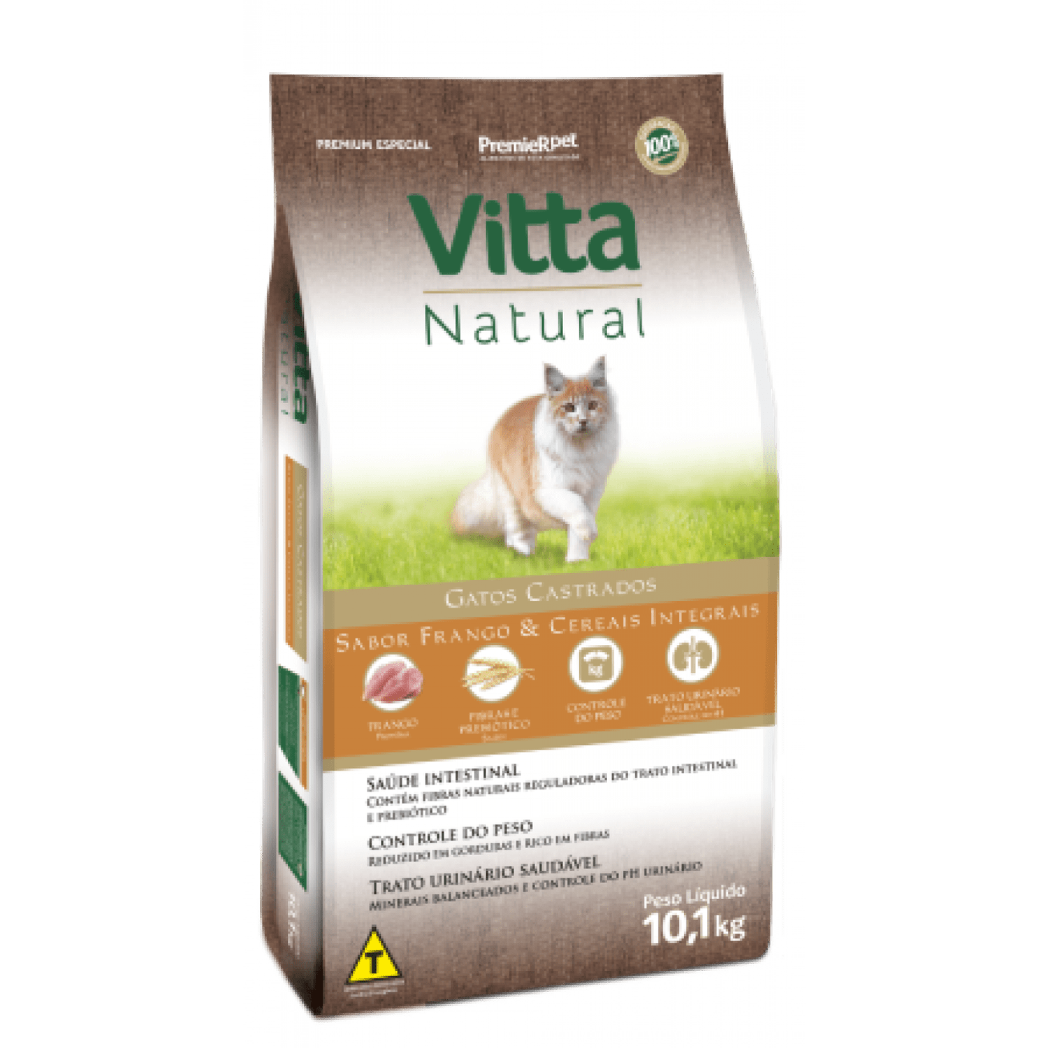 A linha Vitta Natural é formulada com proteínas de alta qualidade e enriquecida com todas as vitaminas e minerais necessários para que os gatos vivam saudáveis e felizes. Elaborado com ingredientes naturais e cuidadosamente selecionados, o produto Vitta Natural Gatos Castrados Sabor Frango, além de muito saboroso, não possui corantes e aromatizantes artificiais. Promove também a saúde intestinal, através da associação de fibras naturais e prebiótico, auxilia no controle de peso, por meio do teor reduzido de gorduras e rico em fibras, e para um trato urinário saudável, contém minerais balanceados e controle do pH.
